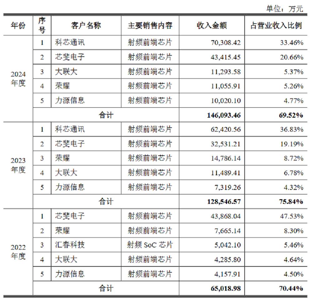 2022年-2024年,昂瑞微前五大客户分别为其贡献了6.5亿元、12.8亿元和14.6亿元营收,分别占当年营收的70.44%、75.84%、69.52%。