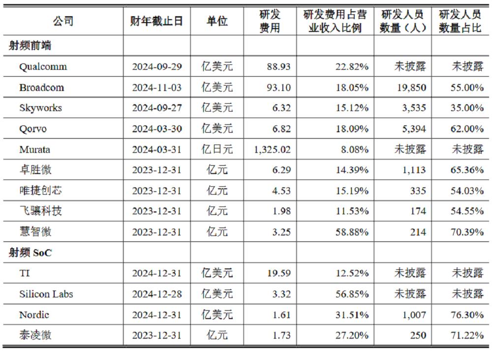 昂瑞微可比公司研发费用占比情况(图源:昂瑞微招股书)
