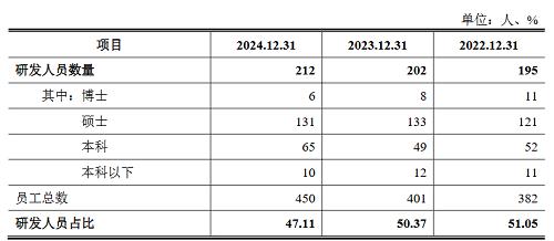 2022年-2024年,昂瑞微研发人员数量不断增加,分别为195人、202人及212人,占员工总人数的比例分别为51.05%、50.37%及47.11%。