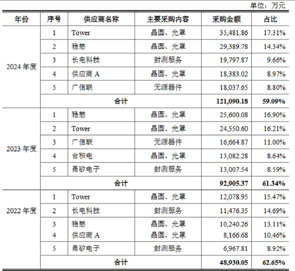 供应商方面,2022年-2024年,昂瑞微对前五大供应商的采购比例分别占当期采购总额的62.65%、61.34%和59.09%。
