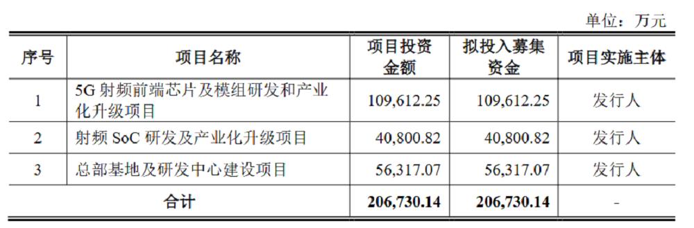本次昂瑞微拟募集资金总额约为20.67亿元,将投入5G射频前端芯片及模组研发和产业化升级项目、射频SoC研发及产业化升级项目、总部基地及研发中心建设项目。