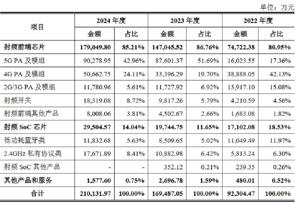 按产品类别划分,包括5G、4G PA及模组在内的射频前端芯片贡献了昂瑞微最多的营收,2022年-2024年,相关产品对其营收贡献占比分别为80.95%、86.76%、85.21%。