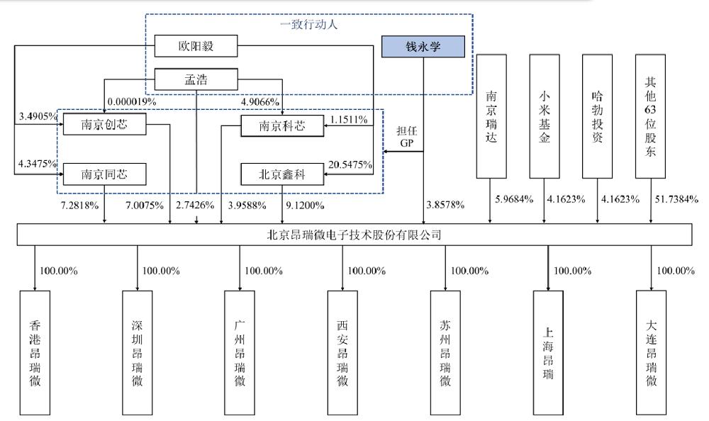 昂瑞微的股权较为分散,单一股东所持表决权均未超过30%。任何单一股东所持的表决权均无法控制股东会或对股东会决议产生重大影响,因此无控股股东。其中,小米基金在昂瑞微中持有约4.16%股份;华为通过哈勃投资在昂瑞微中持有约4.16%股份。