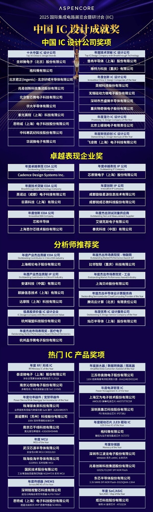 "2025年度中国 IC 设计成就奖"的获奖者由AspenCore社群中电子和IC设计工程师,以及AspenCore分析师团队投票产生。获奖名单如下 (奖项及得奖者排名不分先后):