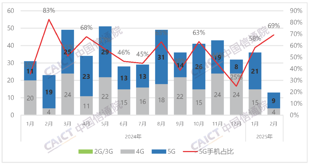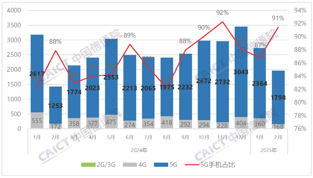 3月31日,信通院披露数据显示,2025年2月,国内市场手机出货量1966.2万部,同比增长37.9%,其中,5G手机1798.2万部,同比增长43.5%,在同期手机出货量中占比91.5%。