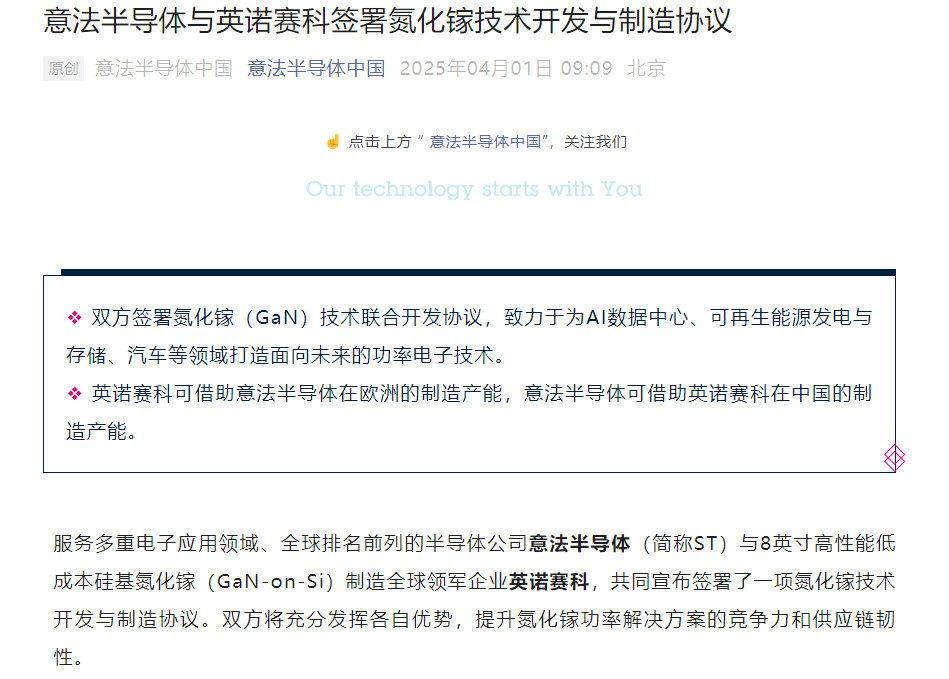4月1日,意法半导体(简称:ST)官宣与英诺赛科共同宣布签署了一项氮化镓技术开发与制造协议。双方将充分发挥各自优势,提升氮化镓功率解决方案的竞争力和供应链韧性。