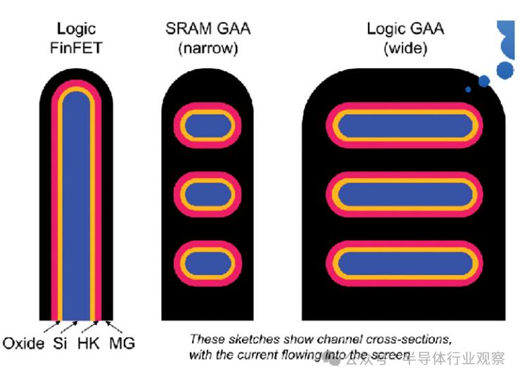 前沿逻辑晶体管正在转向全栅极 (GAA) 架构,因为 FinFET 已经耗尽了能量(图 2)。Synopsys 高级研究员 Victor Moroz 解释说,鳍片宽度由光刻/蚀刻定义,1*sigma 变化量约为 0.6 纳米。“这种变化量可防止将标称鳍片宽度缩小到 ~5.5 纳米以下,以避免低于 ~3.5 纳米的危险(图案崩溃)区域。”