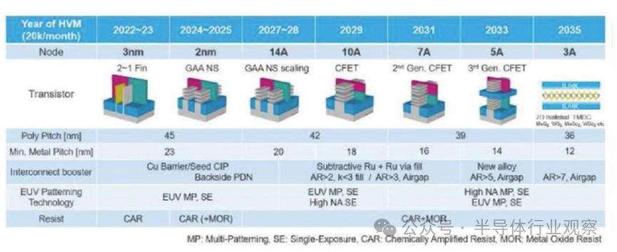 在 IEDM 上,台积电研究人员报告称,他们使用 CFET 构建了“第一个功能齐全的 3D 单片 CFET 反相器,其接触间距为业界领先的 48 nm。”研究人员堆叠了 n-FET-on-p-FET 纳米片晶体管,并带有背面接触和互连,以提高性能和增加设计灵活性,S. Liao 说。图 3 显示了 2035 年的路线图和 CFET 的引入。