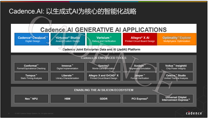 他表示,在 AI 技术深度赋能产业升级的今天, Cadence 确立了三大战略目标:一是构筑要使用 AI 芯片的基础设施;二是通过 AI 技术驱动解决方案创新;三是携手生态伙伴共同开拓更多新的市场。