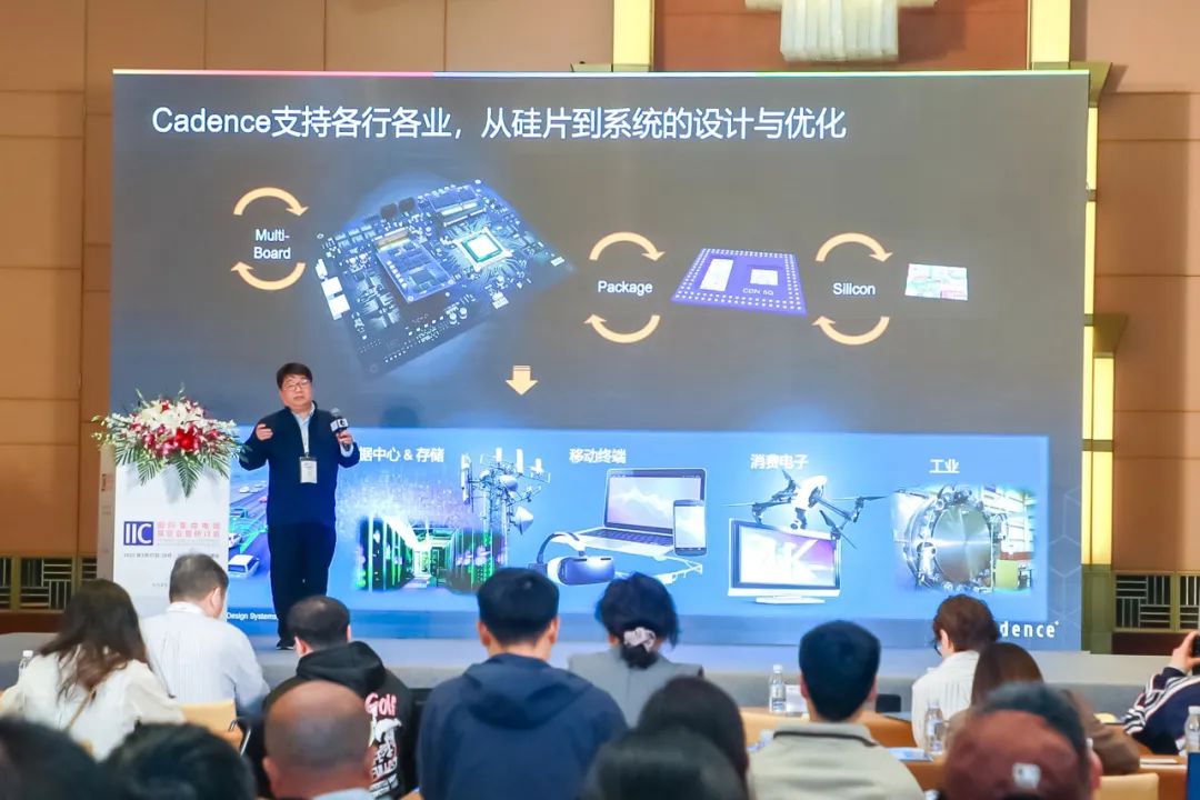 在 Chiplet 与先进封装技术研讨会上,王辉介绍了 Cadence AI 工具在系统设计及仿真中的应用。他表示,Cadence 支持从硅片到系统的设计与优化,通过多板协作、封装和硅片技术服务于汽车行业、数据中心与存储、移动终端、消费电子和工业等领域。