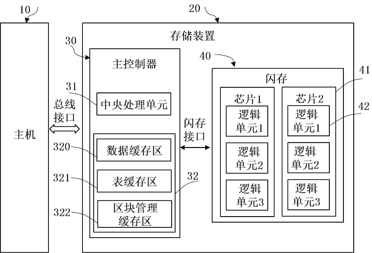 本发明提供一种存储装置及其数据处理方法,存储装置包括闪存;以及主控制器,主控制器包括:静态随机存储器,包括数据缓存区和其他缓存区,数据缓存区包括主机数据的读缓存区和写缓存区;中央处理单元,用以在写缓存区中选取第一存储区,写缓存区和读缓存区共用第一存储区的存储空间,并在读缓存区中选取第二存储区,第二存储区作为其他缓存区的存储空间;第一存储区的存储空间为写入主机数据的单位数据量,写缓存区除第一存储区外的存储空间与第一存储区的存储空间的比值为整数;根据主机数据在写缓存区中的存储容量,将主机数据传输至闪存中,或者将主机数据缓存至写缓存区中。本发明可提高静态随机存储器中存储空间的利用效率。