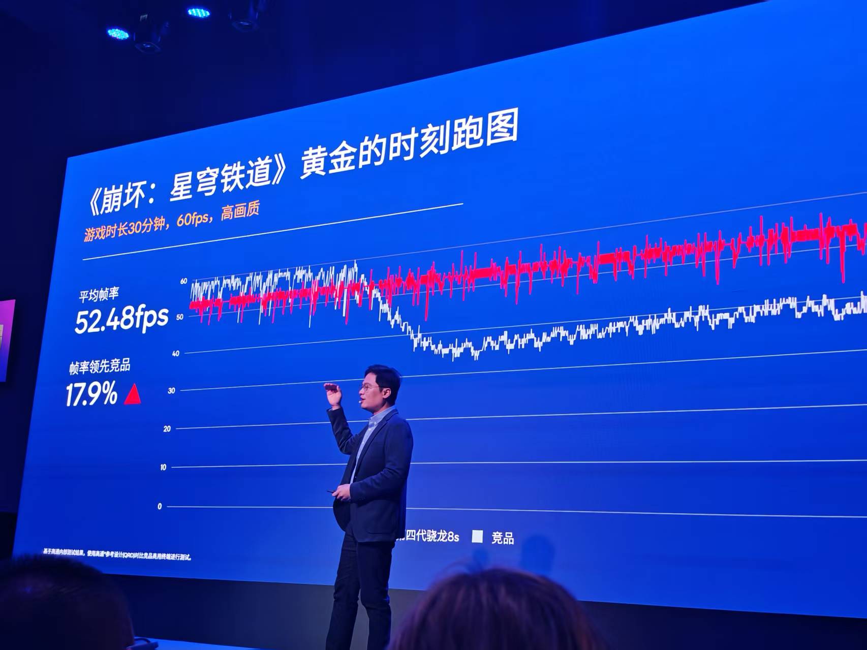 在压力较大的《崩坏:星穹铁道》黄金的时刻跑图中,第四代骁龙8s可以实现52fps的平均帧率,比竞品领先将近18%,整体性能释放非常稳定。