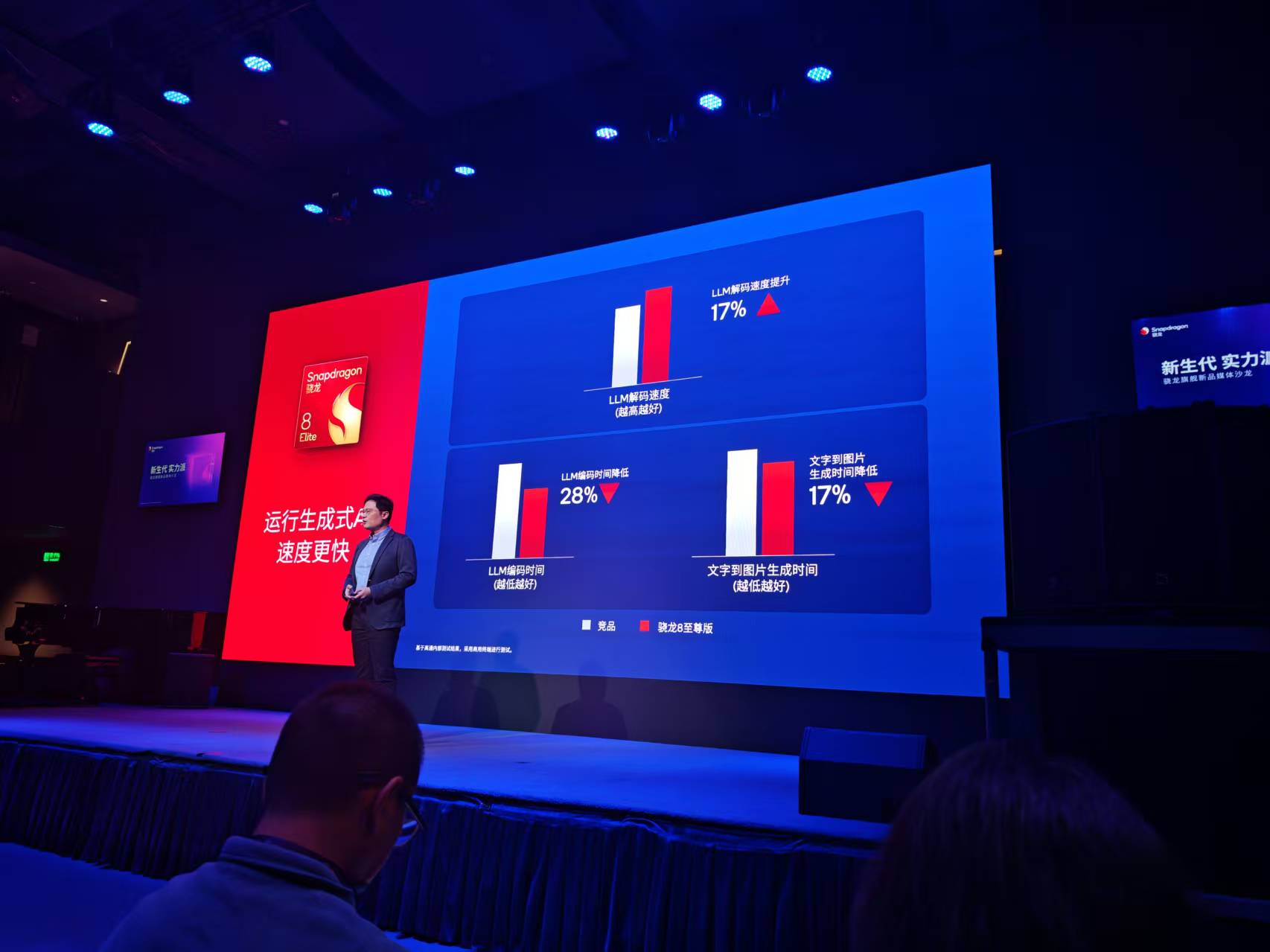 在生成式AI方面,运行LLM编码可以比竞品节约28%的时间。续航方面,模拟用户使用场景进行续航测试,骁龙8至尊版的功耗比竞品低14.7%。