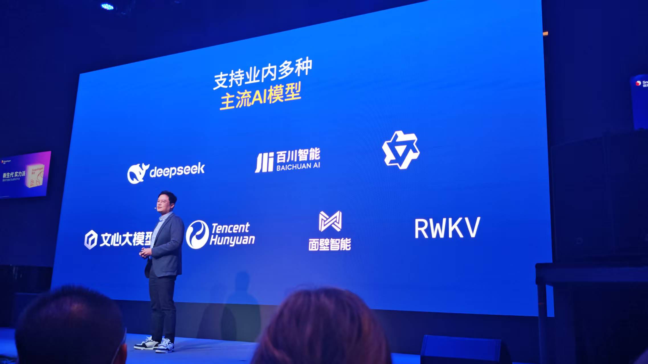 多种主流大语言模型均可在第四代骁龙8s上部署,包括这些业内最受欢迎的AI模型,如DeepSeek、百川、通义千问、文心大模型、腾讯混元、面壁智能、RWKV。