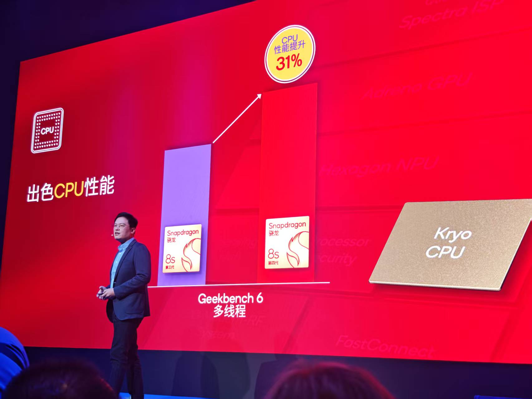 据马晓民介绍,与前代相比,第四代骁龙8s的CPU性能提升高达31%。这意味着在线视频播放、游戏和多任务处理将变得更快、更流畅,让用户全天都能保持最佳状态,完成更多任务。