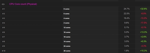 快科技4月5日消息,根据CPU-Z统计,8核CPU已经成为最受用户欢迎的选择,市场份额一年内增长32.6%。
