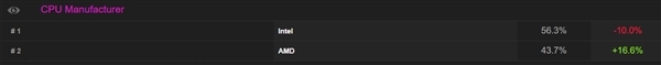 品牌方面,Intel份额56.3%,虽然份额依然领先,但受欢迎程度低了10%。反观AMD,份额已经提升到43.7%,受欢迎程度比去年高出16.6%。