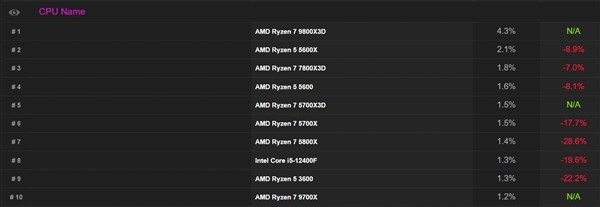AMD锐龙7 9800X3D排名十大最受欢迎CPU首位,份额4.3%,成为8核CPU的有力推动者。