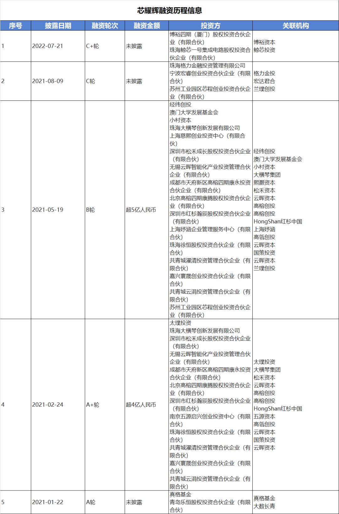 天眼查信息显示,芯耀辉成立至今已完成五轮融资,包括真格基金和大数长青投资的A轮;高瓴创投、红杉中国、云晖资本和高榕资本联合投资,松禾资本、五源资本、国策投资和大横琴集团等机构参投的A+轮;经纬创投、澳门大学发展基金、小村资本等机构投资的B轮;以及格力金投、兰璞创投投资的C轮和博裕资本、鲸芯投资加持的C+轮。