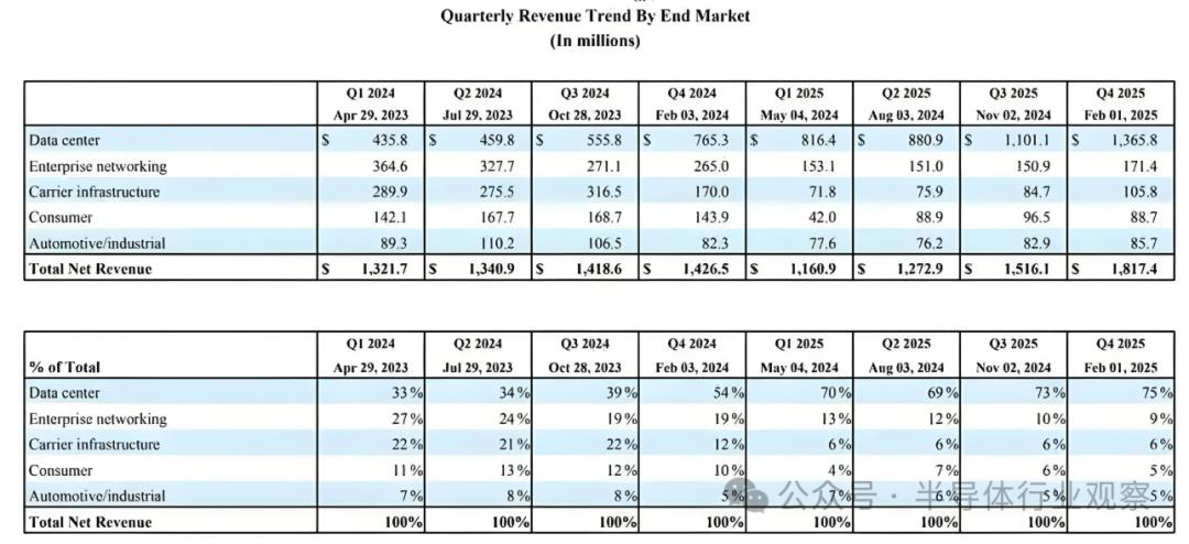 数据中心业务当前已成为Marvell的核心增长引擎,根据最新披露的财报数据显示,Marvell 2025财年第四季度实现了18.17亿美元的净营收,同比增长27%,刷新了公司季度营收纪录。其中,数据中心业务季度营收13.66亿美元,同比增长78.5%,主要是受AISC及光模块DSP芯片增长的带动。其中该季度公司AI 业务收入达7亿美元左右,主要是亚马逊等客户定制ASIC等产品需求增长的带动。