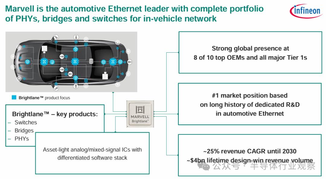Marvell的汽车以太网业务有50多家汽车制造商客户,其中包括排名前十汽车制造商中的8家。凭借这一强大的客户根基,据相关数据预测,该业务在2025年预计将贡献2.25亿-2.5亿美元的收入,毛利率更是高达60%。更为诱人的是,其附带的到2030年40亿美元的design-win储备,犹如一座蕴藏丰富的宝藏,为英飞凌在自动驾驶、车联网等领域的长期布局奠定了坚实的基础。
