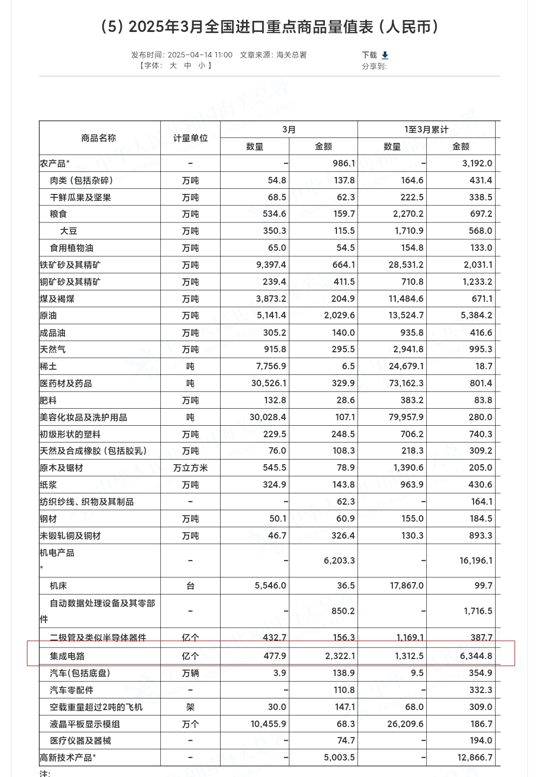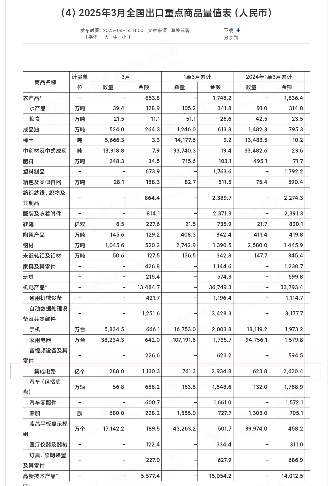 2025年第一季度,我国出口机电产品3.67万亿元,增长8.7%。其中,自动数据处理设备及其零部件3428.3亿元,增长7.9%;集成电路出口数量增长22.0%至761.3亿个,出口金额增长12.0%至2934.8亿元;汽车1848.6亿元,增长3.3%;手机2003.8亿元,增长1.6%。