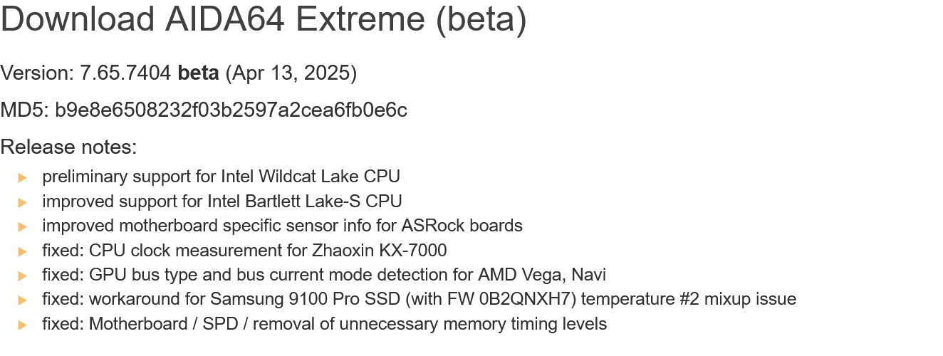此外,AIDA64 7.65.7404 beta 版本还改进了对英特尔 Bartlett Lake-S 处理器、华擎主板特定传感器信息的支持;修复了兆芯 KX-7000 处理器的频率测量、针对 AMD Vega、Navi GPU 的总线类型与当前模式侦测、特定固件三星 9100 Pro 固态硬盘的温度显示、不必要的内存时序等级。