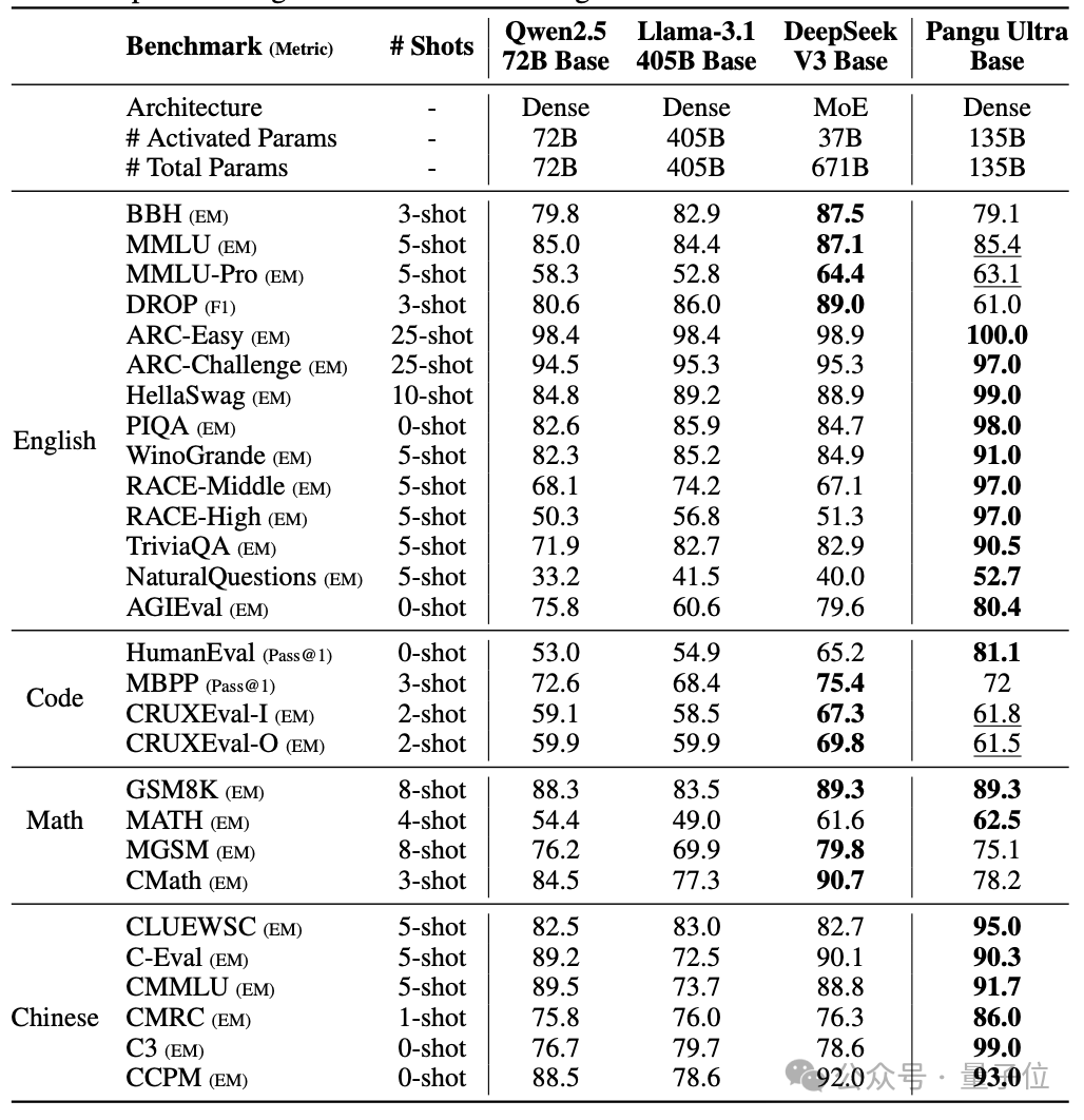 在预训练阶段模型的评测中,盘古 Ultra 在绝大部分英文基准任务和全部中文任务上取得了最佳性能,优于 Llama 405B、DeepSeek-V3 等 baseline 模型。