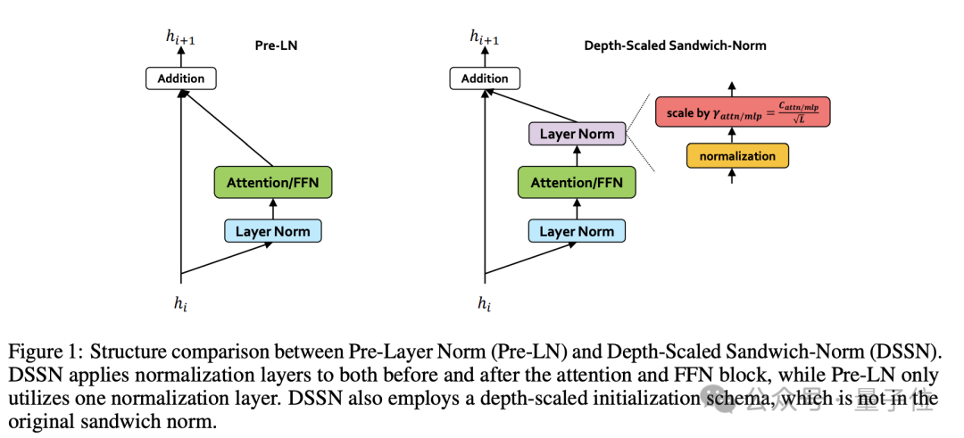 传统的 Transformer 通常使用 Pre-LN 层归一化,但在深度模型中,Pre-LN 容易导致每个子层输出尺度的波动,引发训练不稳定。