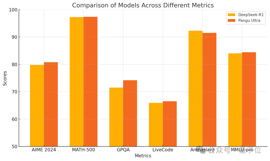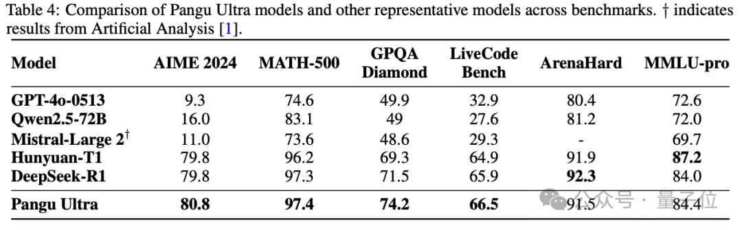综合来看,盘古 Ultra 超越了包括 GPT-4o、Mistral-Large 2 等强大模型,与 DeepSeek-R1 等 MoE 模型竞争激烈。