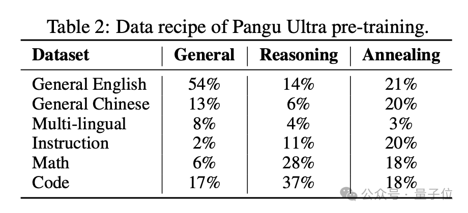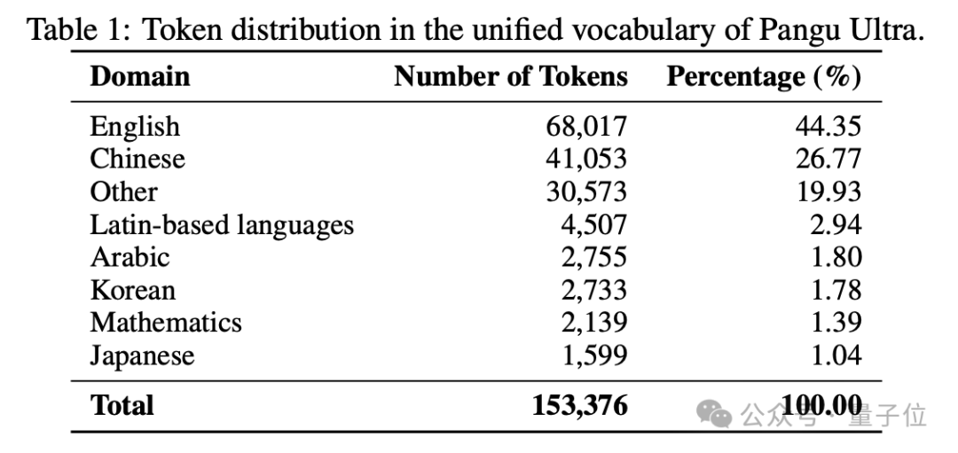 另外,盘古团队也针对 Tokenizer 进行了优化,通过在通用中英文、代码、数学等不同领域分别进行词频统计,再合并去重,最终得到了一个兼顾领域覆盖和编码效率的 153376 个 token 的平衡词表。