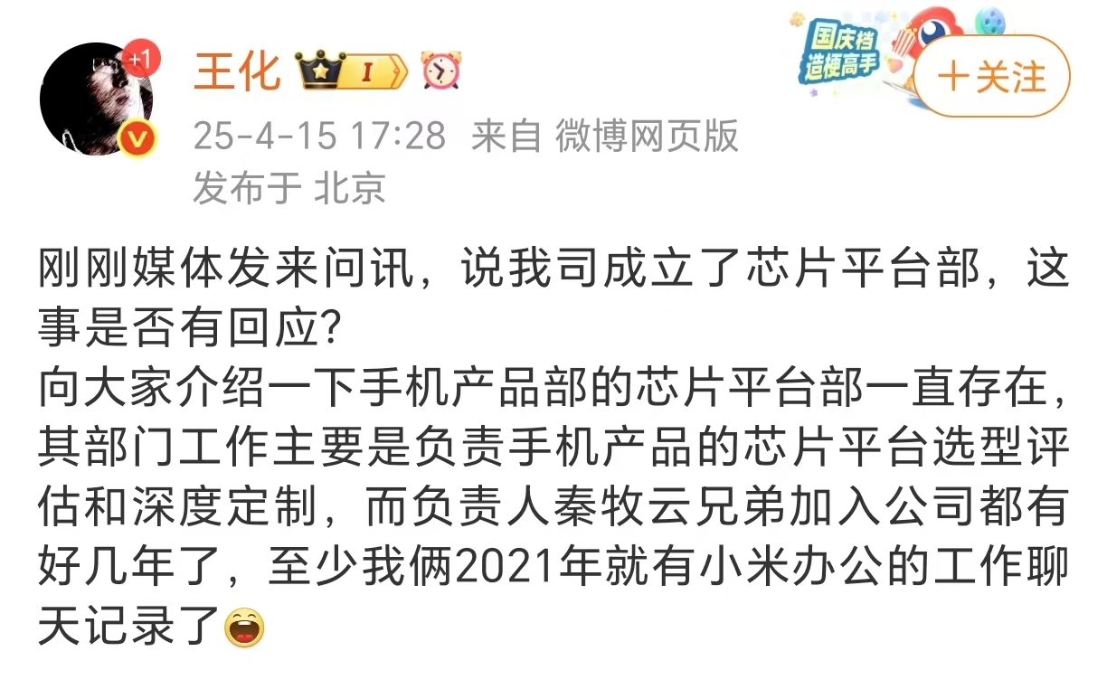 小米集团公关部总经理王化发文回应小米成立芯片平台部相关消息:刚刚媒体发来问讯,说我司成立了芯片平台部,这事是否有回应?向大家介绍一下手机产品部的芯片平台部一直存在,其部门工作主要是负责手机产品的芯片平台选型评估和深度定制,而负责人秦牧云加入公司都有好几年了,至少我俩2021年就有小米办公的工作聊天记录了。