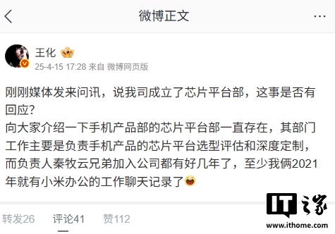 对于这一说法,小米集团公关部总经理王化回应称:手机产品部的芯片平台部一直存在,其部门工作主要是负责手机产品的芯片平台选型评估和深度定制,秦牧云早在 2021 年就与他在小米办公平台存在对话记录。
