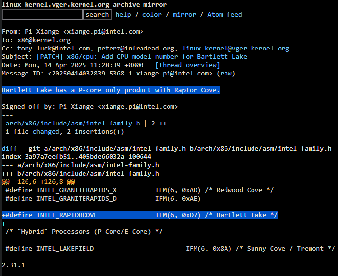 英特尔工程师在Linux内核中为Bartlett Lake CPU添加了一个识别条目,将它们归类为CPU系列6,型号215(0xD7)。这些代号使软件能够确定处理器系列及其支持的特定硬件指令。工程师还指出,“Bartlett Lake包含采用Raptor Cove的纯P核产品”,这进一步证实了之前的所有泄露信息。