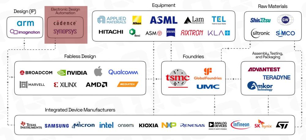 EDA公司处于半导体产业上游,客户遍布半导体产业链,从上游的英伟达、苹果这样的设计公司,到下游的台积电这样的制造公司,都需要配套专用产品,这种全产业链的自研,对于行业龙头公司来说是一项巨大的挑战。