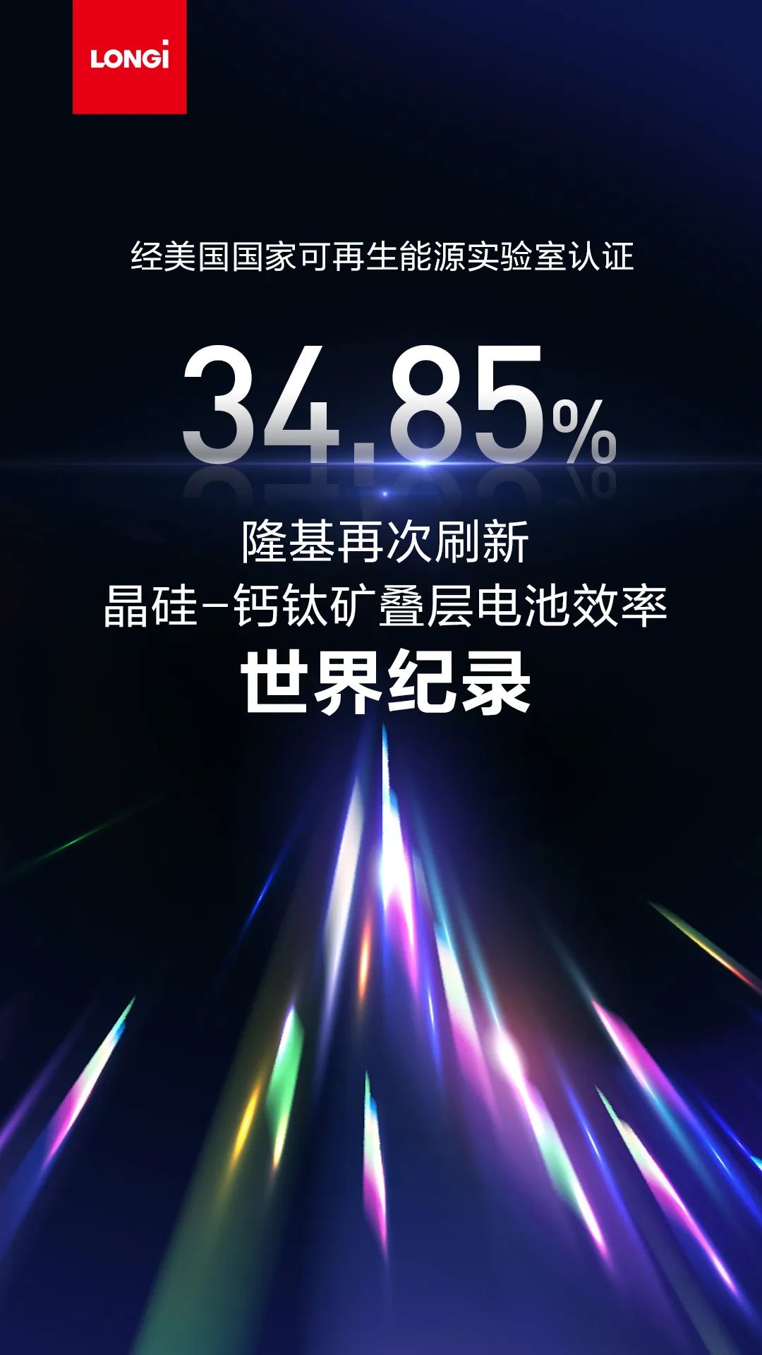 IT之家 4 月 16 日消息,隆基绿能今日宣布电池研发再次取得重大突破。经美国国家可再生能源实验室(NREL)认证,隆基自主研发的晶硅-钙钛矿两端叠层太阳电池转换效率达到 34.85%,再次刷新晶硅-钙钛矿叠层电池效率世界纪录。