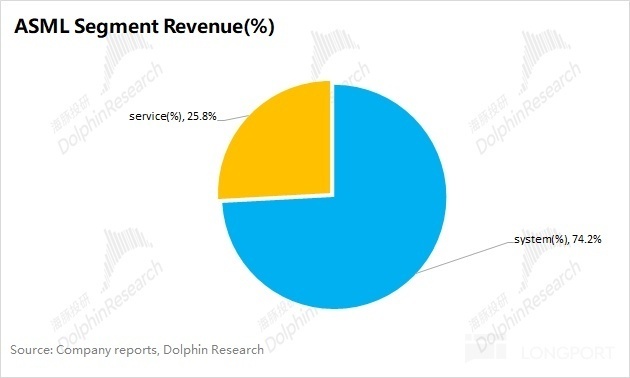 阿斯麦(ASML)的业务由系统销售收入和服务收入两部分构成,其中系统销售收入占比接近 3/4,是公司最核心的收入来源。