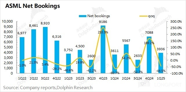 此前市场本身就对公司有所担心:1)半导体终端市场的回暖有所乏力;2)英特尔、三星等都大幅削减了 2025 年的资本开支预期。而公司一季度的净新增订单环比下滑 44%,至 39.4 亿欧元(低于调整后的买方预期 40.6 亿欧元)。对于阿斯麦 ASML,从本次给出的指引和订单情况看,并没看到需求明显好转的迹象,这将进一步降低市场对公司的预期。