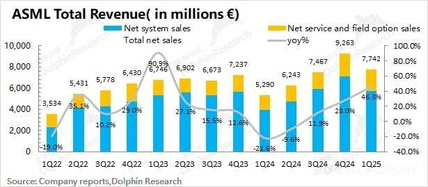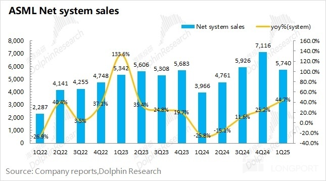 阿斯麦(ASML)的系统销售收入在 2025 年第一季度实现 57.4 亿欧元,同比增长 44.7%。系统销售业务的同比增长,主要是 EUV 和 DUV 系列产品的带动。而环比层面,本季度系统销售收入有所回落,主要是受季节性因素影响,除 EUV 外,其余各产品收入均有所回落。