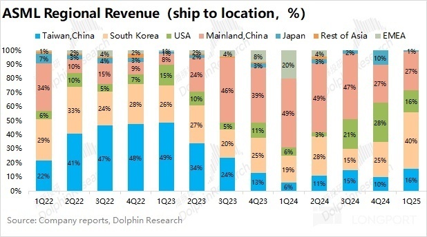 阿斯麦 ASML 本季度收入主要来自于韩国、中国大陆、中国台湾和美国,四者的合计收入占比达到 99%。其中受韩国存储等需求提升的影响,本季度韩国地区收入占比达到 40%。