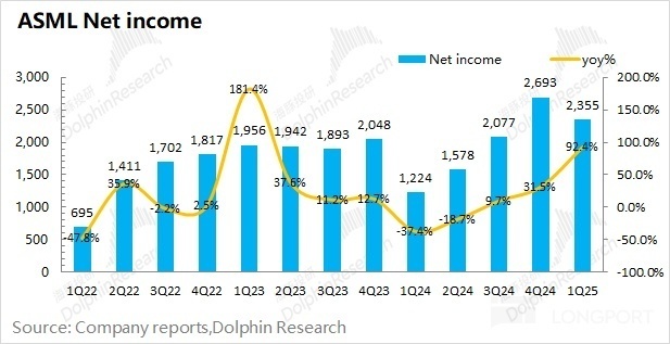 1.4 净利润端:阿斯麦(ASML)在 2025 年第一季度净利润为 23.55 亿欧元,同比增长 92.4%。虽然公司本季度收入端受季节性因素的影响,但公司本季度利润端同比仍有明显增长,主要得益于公司本季度毛利率达到了超预期的 54%。