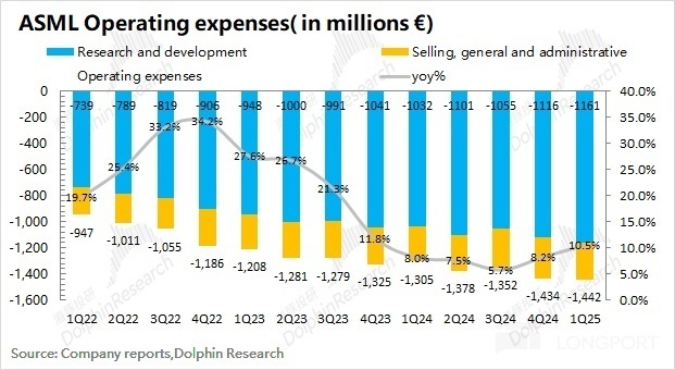 1.3 经营费用端:阿斯麦(ASML)在 2025 年第一季度经营费用为 14.42 亿欧元,同比增长 10.5%。