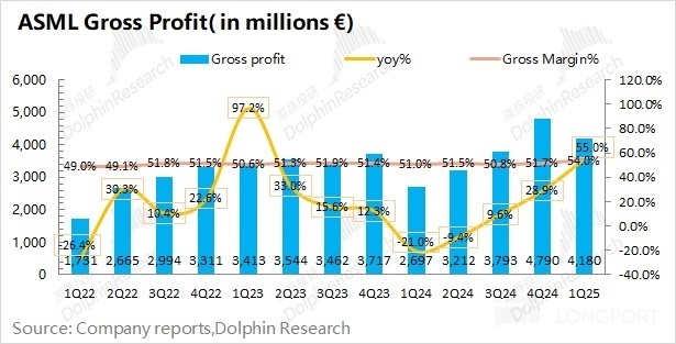 1.2 毛利及毛利率:阿斯麦(ASML)在 2025 年第一季度实现毛利 41.8 亿欧元,同比增长 55%。具体毛利率方面,公司本季度毛利率 54%,继续回升,超公司指引上限(52-53%),主要是受服务收入及 EUV 占比提升的结构性影响。