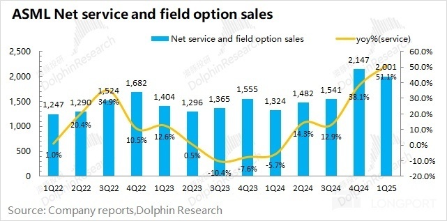 阿斯麦(ASML)的服务收入在 2025 年第一季度实现 20 亿欧元,同比增长 51.1%。阿斯麦的服务收入,主要包括设备维护等项目,受行业周期影响较小。随着公司设备出货数量的增加,公司服务收入的增速也有所加快,当前公司的服务收入已经维持在 20 亿欧元左右。