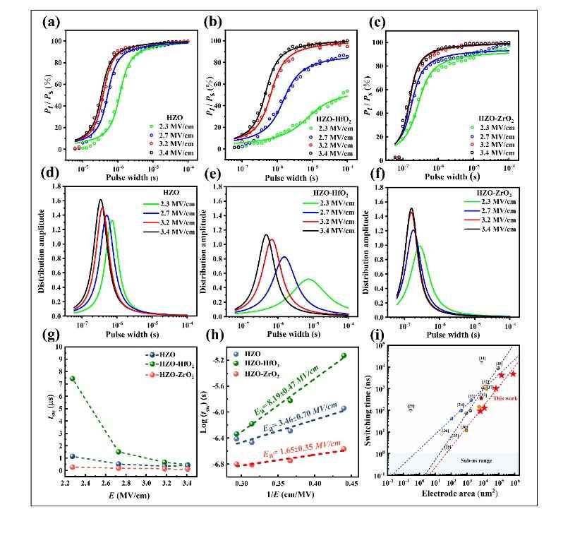 图3.三种结构Hf0.5Zr0.5O2基薄膜极化翻转速度及Lorenz翻转动力学拟合结果图