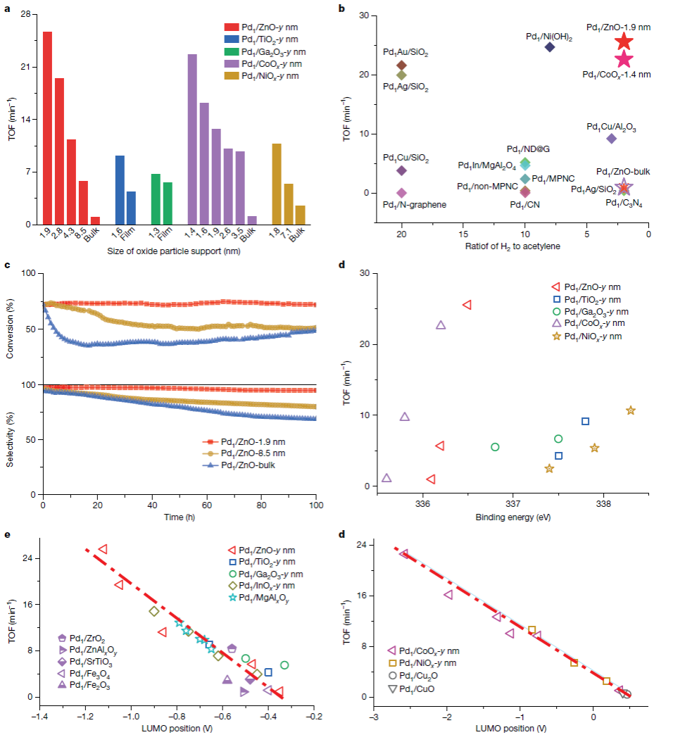 在乙炔选择性加氢反应中,研究发现当ZnO、CoOₓ等载体尺寸降至纳米级时,Pd SACs在保持高选择性的同时,其活性较传统块体氧化物负载的Pd SACs提升20倍以上,打破了活性与选择性间的“跷跷板”效应。其中,1.9 nm ZnO负载的Pd SACs在80°C下表现出25.6 min⁻¹的优异活性,远超文献报道的其他Pd SACs,且为Pd₁Ag/SiO₂单原子合金催化剂的活性的46倍。值得注意的是,该催化剂在100 h稳定性测试中未出现积碳或金属团聚现象,展现出了卓越的稳定性(图2),相反,传统的体相ZnO负载的PdSAC,则出现了催化选择性降低和金属严重聚集现象。进一步研究发现,同类型载体的Pd SACs活性与Pd价态呈线性相关,但不同种类载体的PdSACs的活性与价态并无直接关联。相反,研究表明,所测试的全部PdSACs的催化活性与实验上测得的载体LUMO能级位置呈线性关系。
