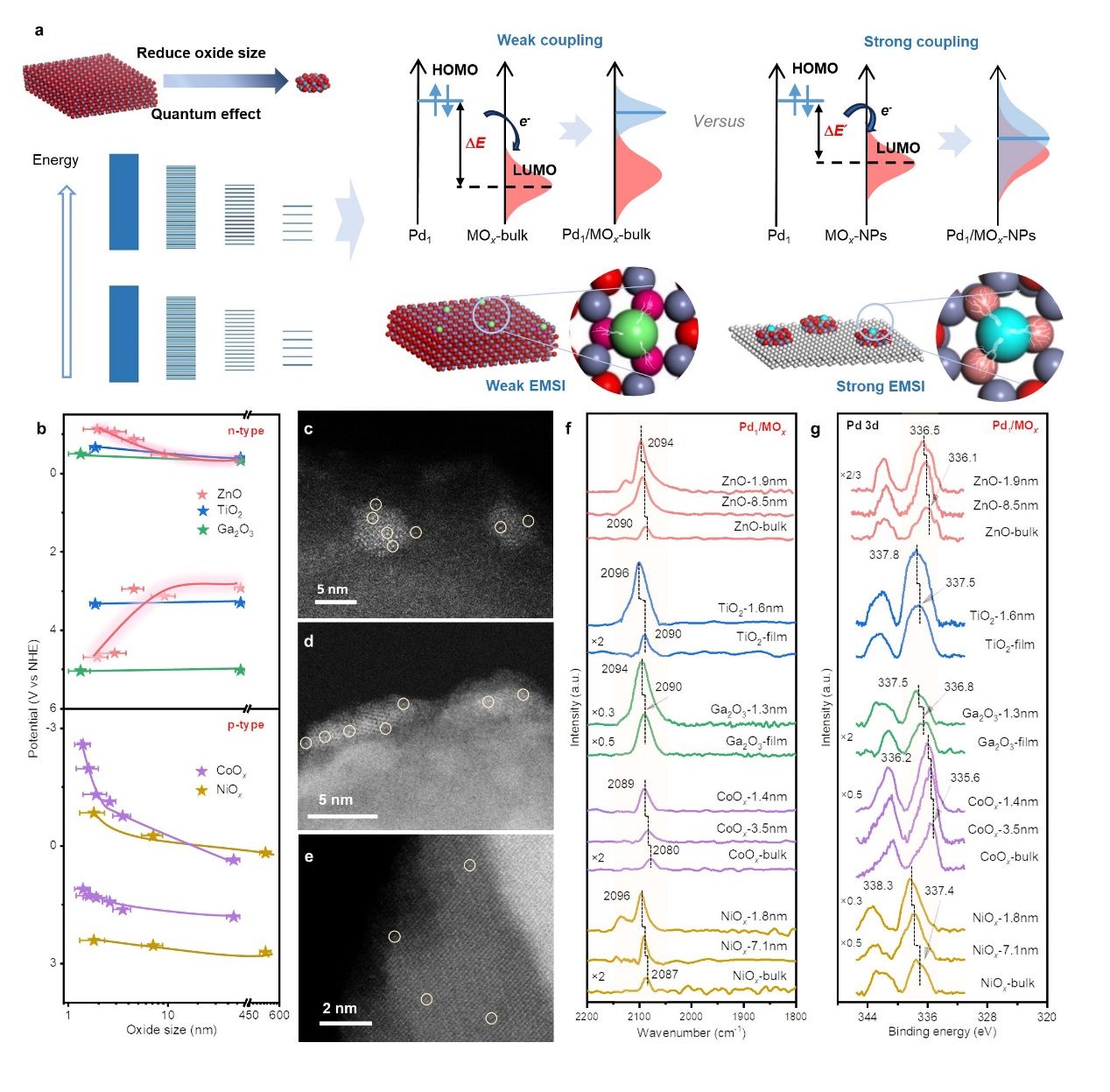 该工作中,路军岭教授研究团队在14种半导体载体表面构建了34种钯(Pd)单原子催化剂,通过调控载体种类与尺寸,实现了对载体最低未占分子轨道(LUMO)和最高占据分子轨道(HOMO)能级位置的精准调控。具体而言,团队首先利用原子层沉积(ALD)技术在SiO₂基底上制备了不同尺寸的MOₓ(M=Zn、Co、Ni、Ga、Ti)氧化物颗粒。紫外可见吸收谱和Mott-Schottky 测试确定了上述氧化物的LUMO与HOMO能级位置随颗粒尺寸的演化。随后,团队进一步通过Pd ALD技术将Pd单原子选择性沉积于MOₓ颗粒表面,获得系列Pd₁/MOₓ SACs。杨冰副研究员则利用球差校正扫描电镜确认了Pd单原子在MOₓ氧化物颗粒表面上的成核。原位漫反射红外CO吸附与原位X射线光电子能谱分析进一步表明,随着氧化物尺寸减小,CO吸附峰发生蓝移,Pd单原子价态逐渐升高,证实了Pd与MOₓ间电子相互作用的增强(图1)。