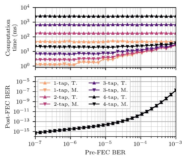 为了解决这一问题,该团队提出了一种新型误码率理论模型——Multi-Burst模型。传统方法通常采用马尔可夫模型对DFE引起的误码传递(error propagation)现象进行建模,并基于网格图(trellis)的动态规划算法推导单个FEC帧内的错误分布,从而计算FEC纠后误码率。与此不同,Multi-Burst模型的创新性在于:将单个FEC帧内的多段突发误码(burst error)视为近似相互独立的事件,而非马尔可夫模型中彼此关联的状态。具体而言,该模型首先通过突发误码表(burst table)描述单段突发误码的统计规律,再结合多段突发误码表的统计学关联,综合评估其对系统误码率的整体影响。