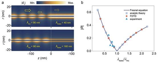 图二:等离激元在碳纳米管异质结处的反射/透射规律。(a)有限时域差分法模拟得到的等离激元反射/透射;(b)实验、理论和仿真结果均表明一维等离激在碳管异质结处的反射行为符合经典的菲涅尔公式