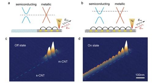 图一:基于碳纳米管异质结的等离激元场效应晶体管示意图(a,b)和近场光学图像(c,d)。其中(a,c)为等离激元晶体管器件的关态,(b,d)为晶体管器件的开态